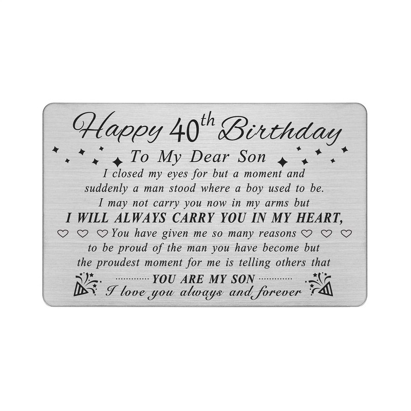 - Son 40th Birthday Cards - Happy 40th birthday to my dear son, I closed my eyes for but a moment and suddenly a man stood where a boy used to be. I may not carry you now in my arms but I WILL ALWAYS CARRY YOU IN MY HEART, You have given me so many reasons to be proud of the man you have become but the proudest moment for me is telling others that YOU ARE MY SON, I love you always and forever