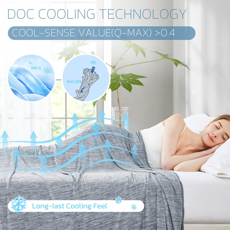 - Long-lasting Cooling Blanket: The DOC Cooling Ice Blanket utilizes Arc-Chill technology (Q-MAX>0.4), a long-lasting cooling technique that absorbs body heat, instantly reducing skin temperature for an immediate cooling effect. Additionally, the design of this summer blanket combines two breathable fabrics, providing continuous cooling effects and achieving lasting freshness and comfort.