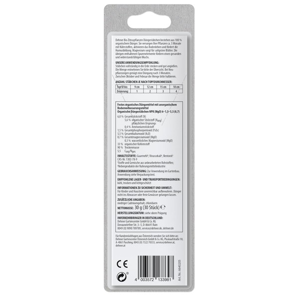 ProduktbeschreibungWenn zwischen den immergrünen Blättern eines Zitronenbäumchens die knallgelben Früchte leuchten, kommt Urlaubsstimmung auf und wir erinnern uns an entspannte Urlaubstage unter südlicher Sonne. Auch Calamondin-Orangen - die neue Kreuzung aus Mandarinen und Kumquat - machen sich gerne auf sonnigen Terrassen und Balkonen breit. Auch wenn die Pflege von Zitruspflanzen kein Hexenwerk ist, so brauchen sie doch eine speziell auf ihre Anforderungen zugeschnittene Nährstoffkombination, um schön zu blühen und aromatische Früchte zu tragen. Die Dehner Bio Düngestäbchen sind ein 100 Prozent organischer Dünger, bei dem die Hauptnährstoffe für Pflanzen NPK im Verhältnis 5+2+4 enthalten sind. Außerdem sind die Dehner Bio Düngestäbchen mit einem Langzeitdünger versehen, der Ihre Zitruspflanzen 90 Tage mit allen wichtigen Nährstoffen versorgt. Steigert auch die Widerstandskraft Ihrer ZitruspflanzenDie Dehner Bio Düngestäbchen Zitruspflanzen sind nicht nur ein organischer Volldünger, sondern sie aktivieren außerdem das Bodenleben und fördern die Humusbildung. Das Ergebnis: Die Pflanzen wachsen besser und blühen üppiger, außerdem können sie sich gegen Schädlinge und Krankheiten besser zur Wehr setzen als schwache Exemplare. So wenden Sie die Dehner Bio Düngestäbchen Zitruspflanzen anStecken Sie die Stäbchen vorsichtig zwischen Wurzelballen und Topf in den Boden - das war's. Bedenken Sie aber auch: erst die richtige Kombination aus Dünger und Wasser macht eine Pflanze stark und schön. Gießen Sie Ihre Zitruspflanzen deshalb im Sommer ein bis zweimal pro Woche. Im Winter, wenn die Pflanzen einen hellen Ort zum überwintern gefunden haben, alle vier bis acht Wochen. Da die Dehner Bio Düngestäbchen über eine Langzeitwirkung von 90 Tagen verfügen, brauchen Sie den Düngevorgang erst nach 3 Monaten zu wiederholen. Beachten Sie aber auch die Winterpause der Pflanzen und halbieren Sie in dieser Zeit die Düngermenge. Frisch eingetopfte Pflanzen sollten Sie erst nach drei Wochen die Dehner Bio Düngestäbchen Zitruspflanzen geben. Für die Menge der Dehner Bio Düngestäbchen pro Topf können Sie sich an unten stehender Tabelle orientieren.9 cm Topf - 2 Stäbchen12 cm Topf - 3 Stäbchen15 cm Topf - 4 Stäbchen18 cm Topf - 5 StäbchenBei größeren Töpfen werden dementsprechend mehr Stäbchen verwendet.GebrauchsanweisungStecken Sie die Stäbchen vorsichtig zwischen Wurzelballen und Topf in den Boden. Bedenken aber auch: erst richtige Kombination aus Dünger Wasser macht eine Pflanze stark schön. Gießen Ihre Zitruspflanzen deshalb im Sommer ein bis zweimal pro Woche. Im Winter, wenn Pflanzen einen hellen Ort zum überwintern gefunden haben, alle vier acht Wochen. Da Dehner Bio Düngestäbchen über Langzeitwirkung von 90 Tagen verfügen, brauchen Düngevorgang nach 3 Monaten zu wiederholen. Beachten auch Winterpause der halbieren dieser Zeit Düngermenge. Frisch eingetopfte sollten drei Wochen geben. Für Menge können sich an unten stehender Tabelle orientieren. 9 cm - 2 Stäbchen, 12 15 4 18 5 Stäbchen. Bei größeren Töpfen werden dementsprechend mehr verwendet.WarnhinweiseVerwenden Sie die Dehner Bio Düngestäbchen Zitruspflanzen mit Vorsicht. Achten Sie darauf, dass Sie die richtige Kombination aus Dünger und Wasser verwenden, um Ihre Pflanzen gesund und stark zu halten. Stecken Sie die Stäbchen vorsichtig zwischen Wurzelballen und Topf in den Boden. Gießen Sie Ihre Zitruspflanzen im Sommer ein bis zweimal pro Woche. Im Winter, wenn die Pflanzen einen hellen Ort zum überwintern gefunden haben, alle vier bis acht Wochen. Beachten Sie auch die Winterpause der Pflanzen und halbieren Sie in dieser Zeit die Düngermenge. Frisch eingetopfte Pflanzen sollten Sie erst nach drei Wochen die Dehner Bio Düngestäbchen Zitruspflanzen geben. Für die Menge der Dehner Bio Düngestäbchen pro Topf können Sie sich an unten stehender Tabelle orientieren. 9 cm Topf - 2 Stäbchen, 12 cm Topf - 3 Stäbchen, 15 cm Topf - 4 Stäbchen, 18 cm Topf - 5 Stäbchen. Bei größeren Töpfen werden dementsprechend mehr Stäbchen verwendet.Set enthält:1x Dehner Bio Düngestäbchen für Zitruspflanzen, 4 x 30 Stück (120 Stück)