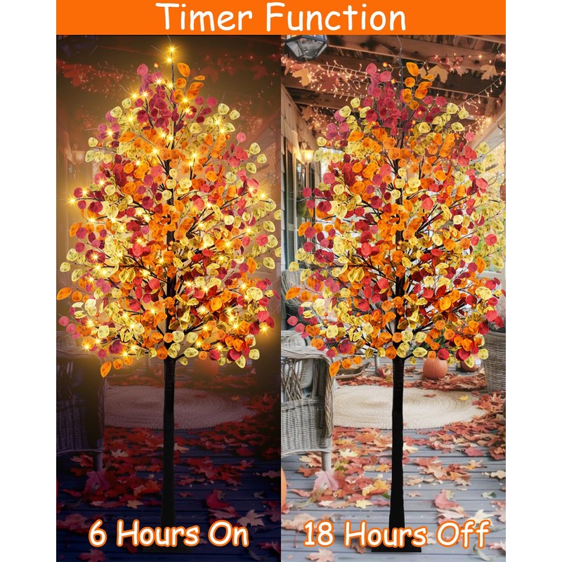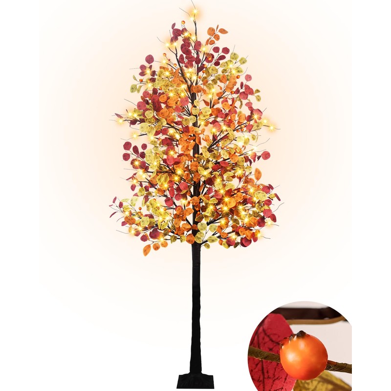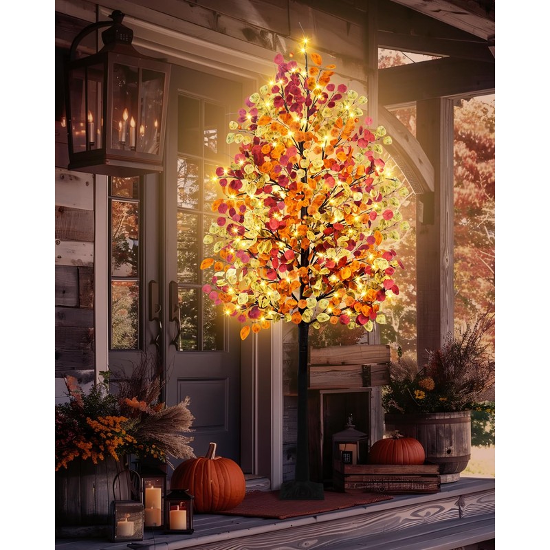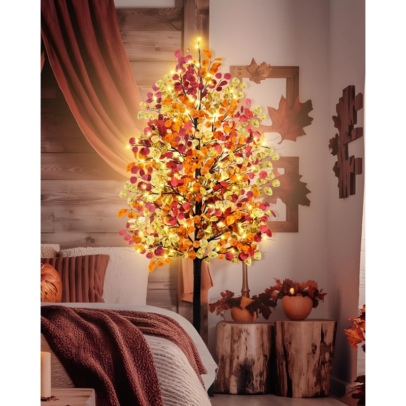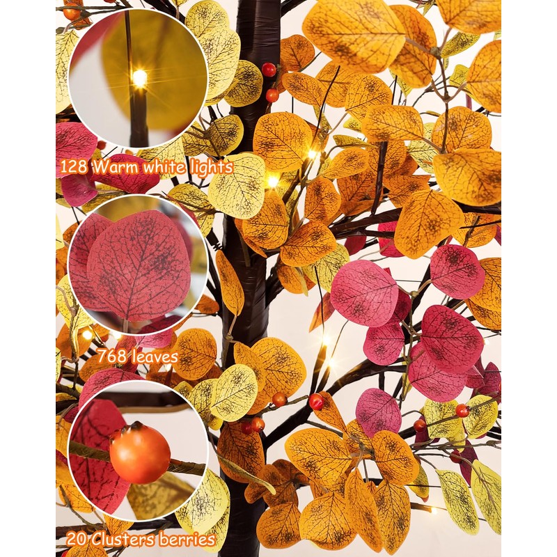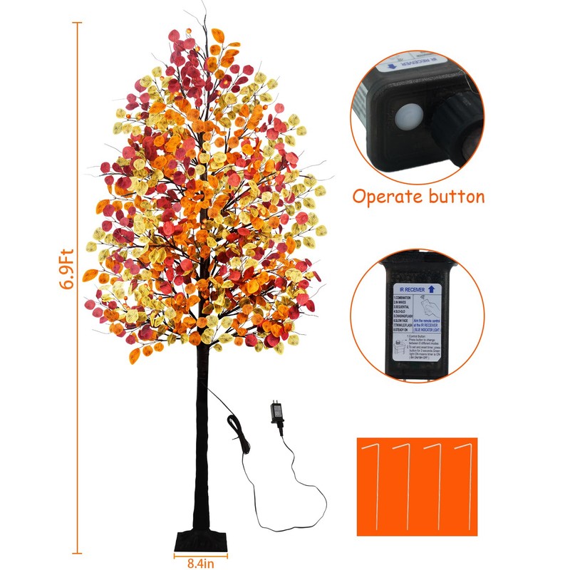 - Size :7 Feet of an artificial fall lighted tree has 16 branches, each with some tricolored(Orange Yellow Autumn)eucalyptus leaves. 128 Warm white LED lights.(8 Flashing Modes: Combination, In waves, Sequential, Slow glow, Chasing, Slow Fade, Flash, Steady on.)