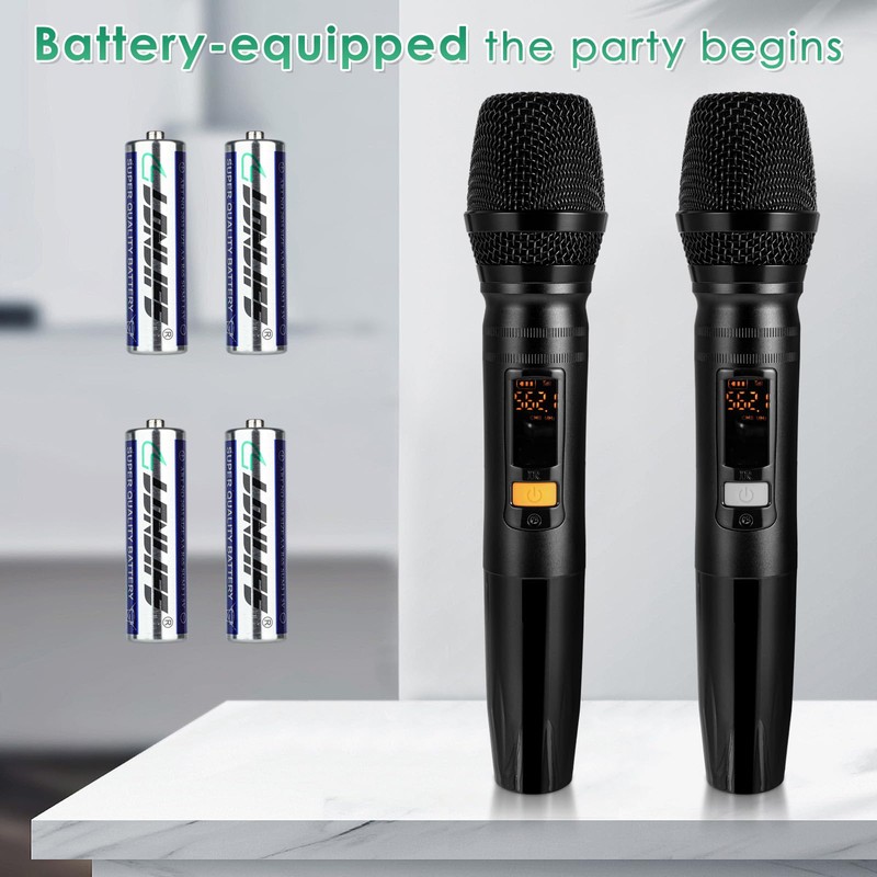 - Long-lasting Microphone Batteries C The wireless microphones use 2 x 1.5V AA batteries (included in the package), providing long usage time (4-6 hours). This ensures a stable audio output during various activities without the need to change batteries frequently.