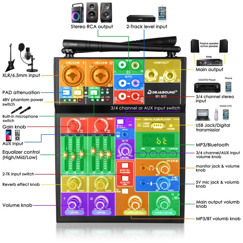 - Versatile Application Scenarios C Whether it's for home karaoke, parties, DJ events, live recording, or small performances, the 5-channel mixer provides a wide range of audio adjustment options, ensuring clear, professional sound experiences.