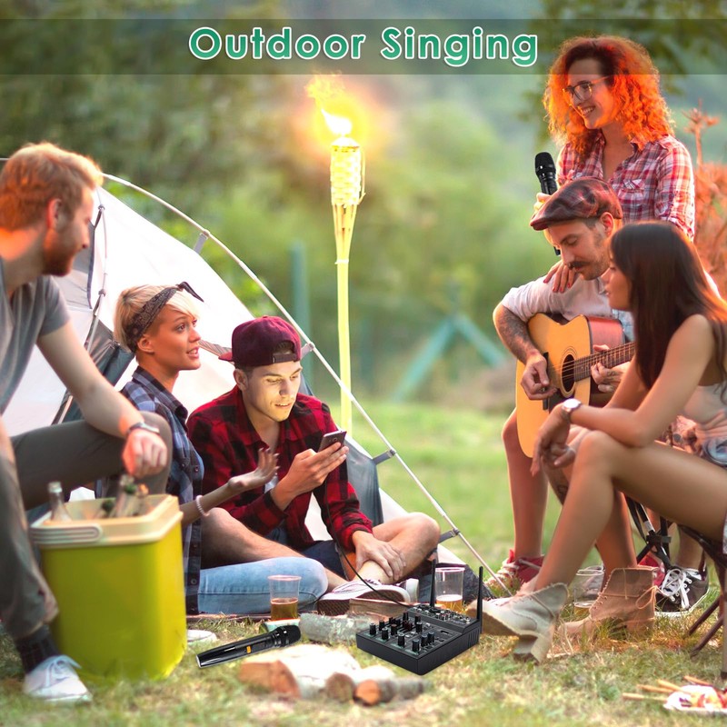 - 5-Channel Audio Mixer with 2 Wireless Microphones C This 5-channel audio mixer comes with 2 UHF wireless handheld microphones, offering a wide range of audio adjustment features. Each channel can be independently adjusted to ensure the best audio mixing for different sound sources. The wireless reception range is up to 180 feet, providing stable wireless audio transmission, ideal for most entertainment settings.