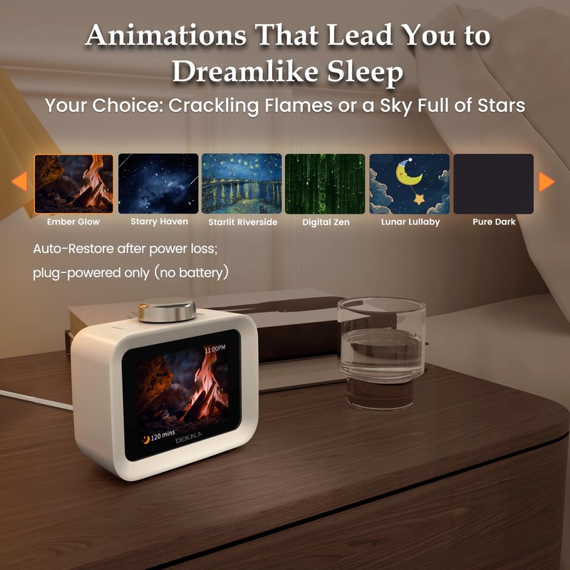- 【Create Healthy Sleep ecosystem】 Build a screen-free sleep sanctuary with Dekala’s all-in-one ecosystem – no scrolling, just tap to play 30+ lab-tuned sounds (white/brown/pink noise) synced with dynamic sleep animations (campfire, stars) , adding 5-min to ∞ Timer, Customize playback duration or let it run all night.