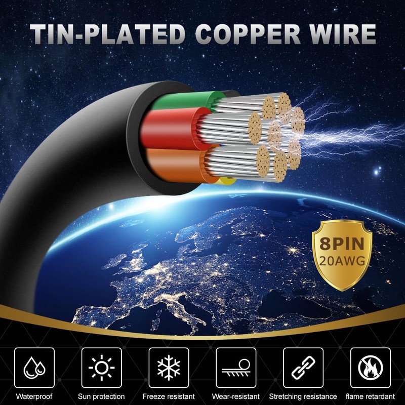 - 【High Conductivity】:20 awg 8 conductor wires have 21 strands of 1.5mm tinned copper wire inside each cable. Tin-plated copper not only has good electrical conductivity, but the tin coating also has the characteristics of strong corrosion resistance and oxidation resistance. Compared with ordinary copper wire, it can greatly extend the service life of the weak power cable. It is also more suitable for soldering