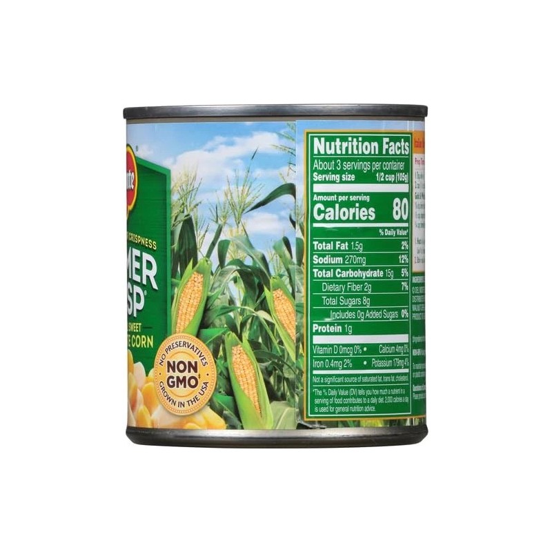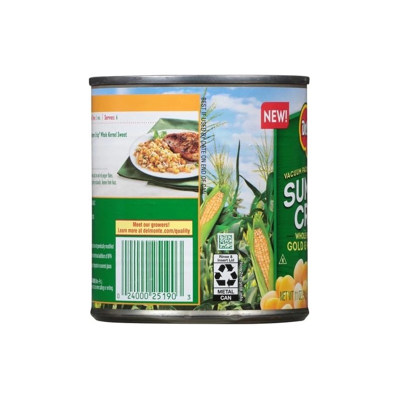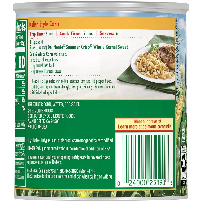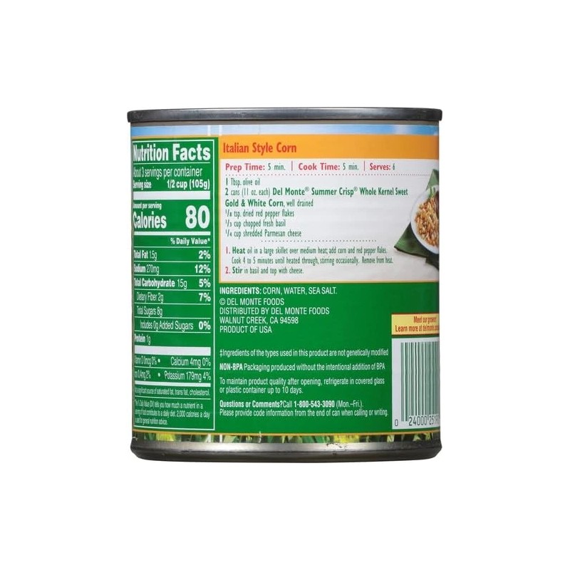 Del Monte Summer Crisp Whole Kernel Sweet Gold and White Corn features summer harvest corn, freshly cut and vacuum-packed at the peak of freshness to seal in flavor, texture and nutrition. Our crisp corn contains just three simple ingredients - non-GMO corn, water, and a dash of sea salt. Del Monte Summer Crisp corn works not only as a delicious side, but also as a stand-alone ingredient. Del Monte works hard to cultivate the freshest, most nutritious fruits and vegetable to use in every one of our products. When you trust Del Monte, you can be sure what you're buying is the peak of quality and nutrition!