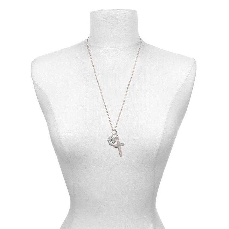 - Silvertone Dove - She will not Fall Engraved Cross Zoey Necklace, 28".