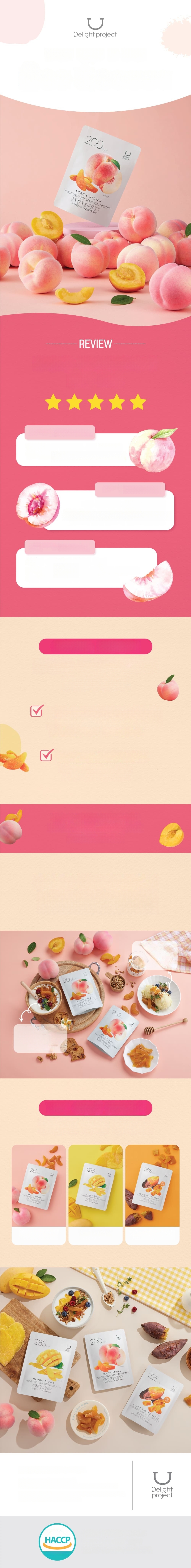 Enjoy the rich taste and scent of real peach slices with added sugar anytime, anywhere. A new textured fruit dessert created under optimal drying conditions. Even if the size and shape of the peach are different when sliced directly from the peach material, the freshness remains the same.