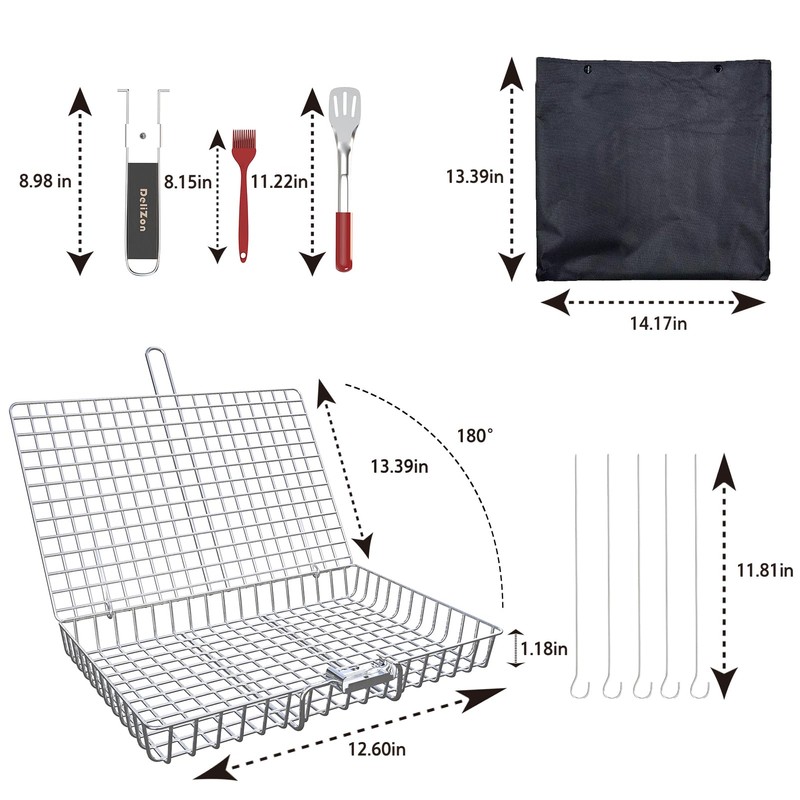 Delizon Delizon Grill Baskets Fish Grilling Rack for Outdoor Grill with Removable Handle, Come with Basting Brush Food Tongs & 5x BBQ Skewers