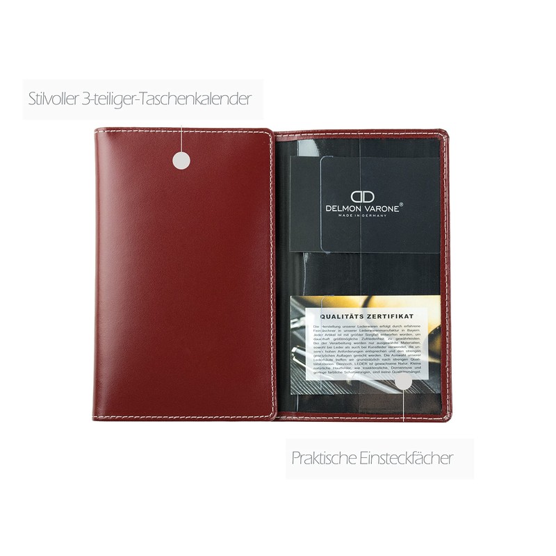 DELMON VARONE - Personalised Pocket Calendar 2025 3-Piece Cambridge Top Grain Leather Case Red - Organiser Diary (1 Month 1 Page) - Book Calendar Monthly Overview & Address Book