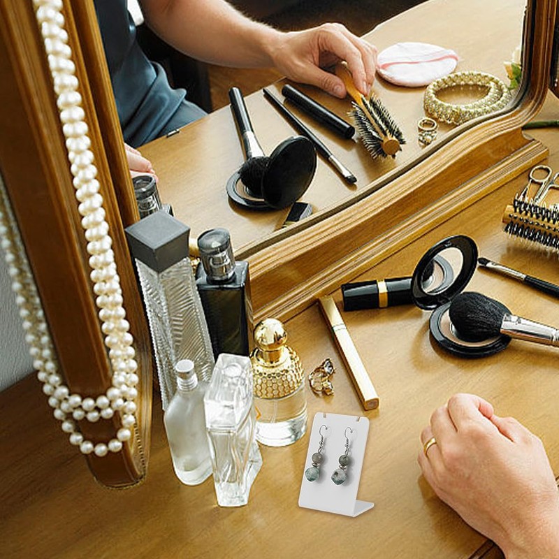 • Elegant L-Shape Design: Beautiful and elegant L shape and thickened base keeps the earring stand stable,each display stand top has two card slots, which can display a pair of earrings or a necklace one time.It is a good organizer and decoration on your dresser or table.