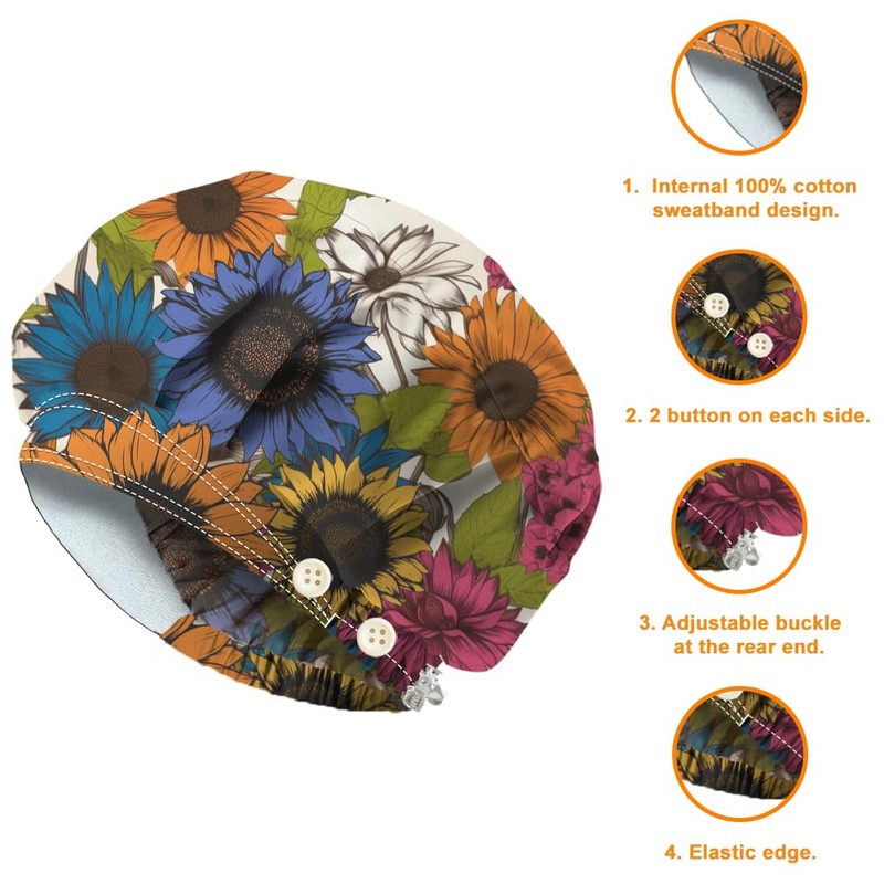 Sunflower Leaves Cotton Adjustable Printed Bouffant Hats Working Caps for Women Men, with Button Size: about 600mm wide, 600mm long.