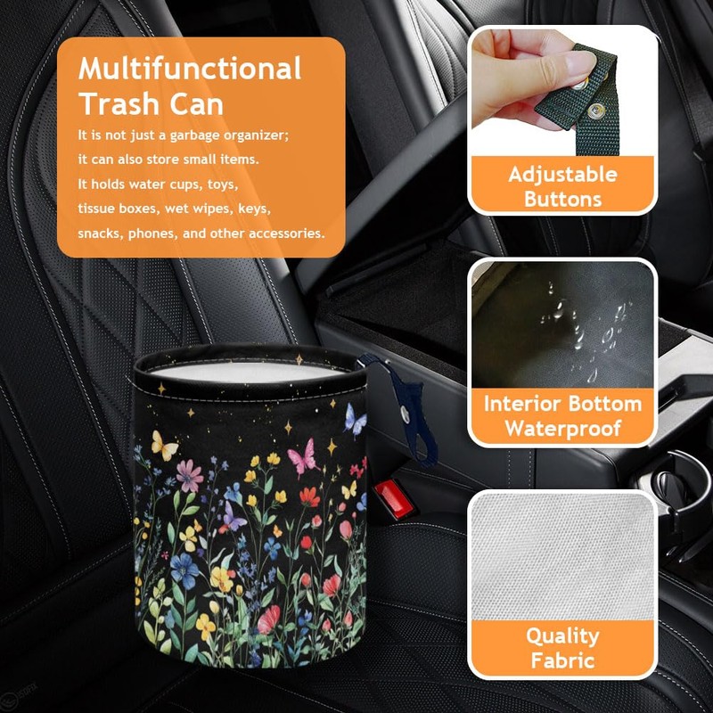 DELORIGIN Wildflowers Moon Car Trash Can Butterfly Waterproof Car Garbage Can Car Seat Back Hanging Trash Bag Portable Camping Waste Bin Storage Bag Collapsible Trash Container for Car (5.9"W,7.2" H)