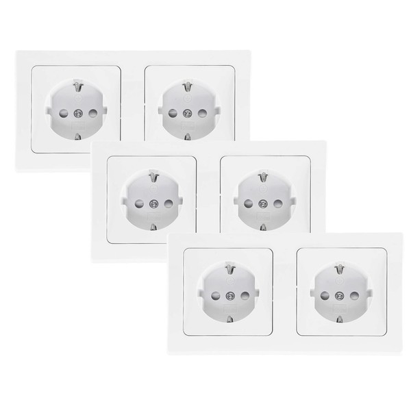 Delphi 2-Way Socket Flush-Mounted 2 x Earthing Contact Sockets with Frame UP Installation - Double Socket Connection Plug Terminal 3 Sets White