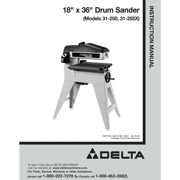Delta 31-250 31-255X 18 x 36" Drum Sander Instructions Manual