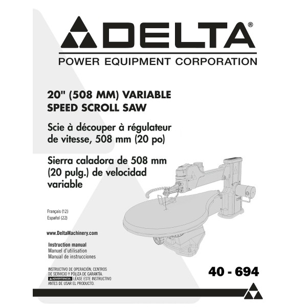 Delta 40-694 20" Variable Speed Scroll Saw Instructions Manual