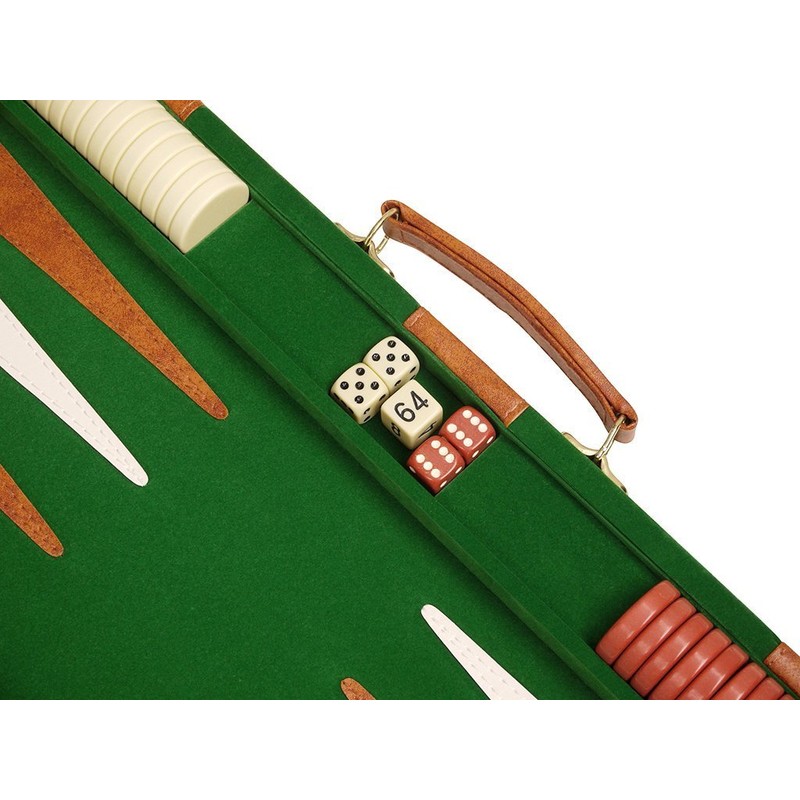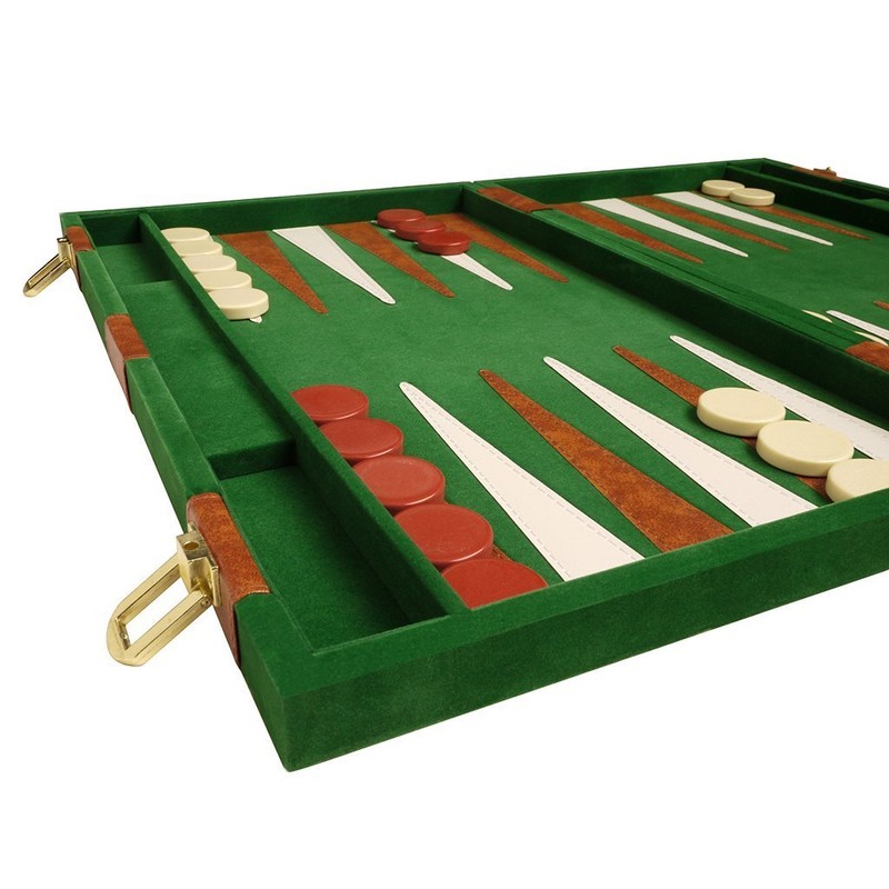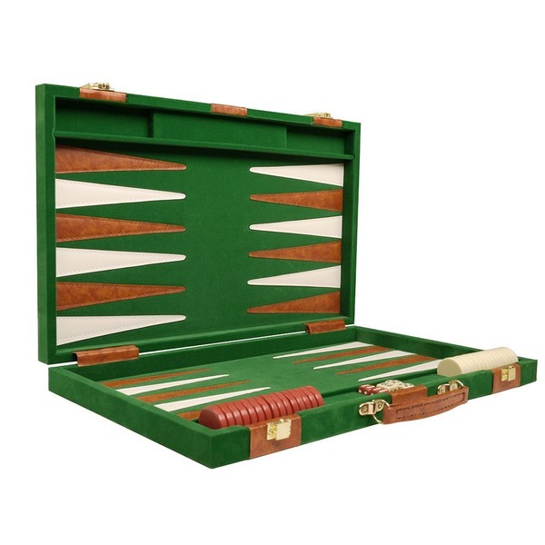 This stunning 15-inch emerald green backgammon set comes in a luxurious velour case with leatherette accent and features an ultra quiet velour playing field. The latches are solid brass.