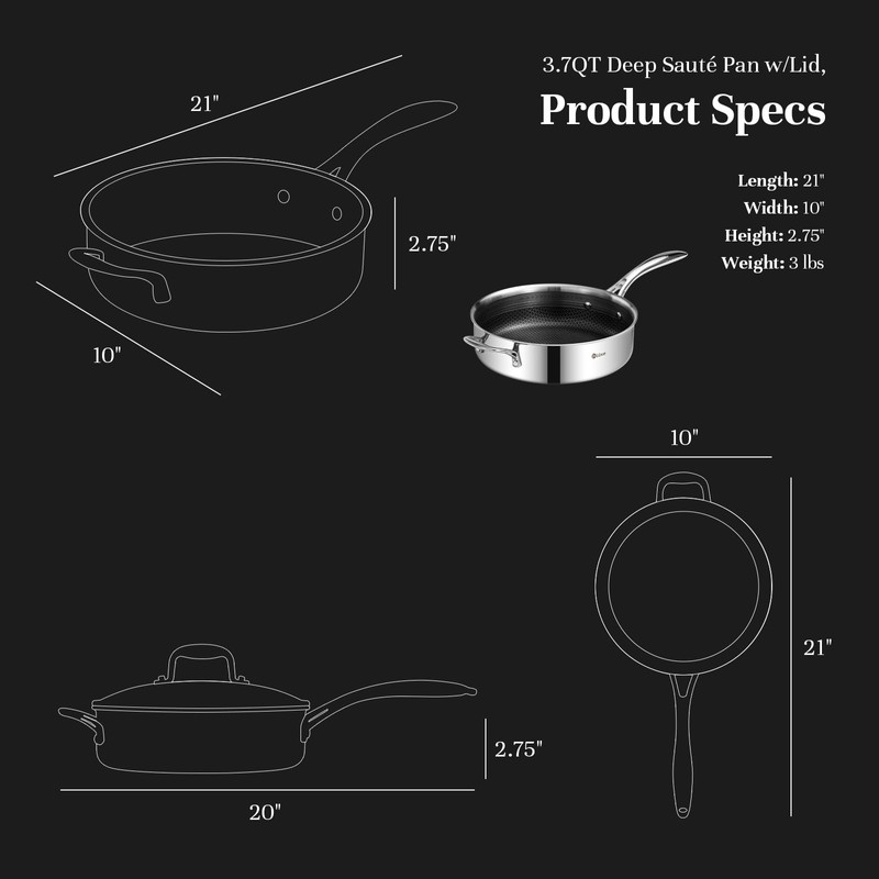- Glass Lid&Stay-Cool Handles:DELUXE 3.7qt deep sauté pan is that handles stayed cool while cooking, which is a big deal because you don't need a pot holder on gas stove. It seamlessly combines the best of both worlds, making you cooking experience a delight. Love the glass lid to see how it’s cooking. The small hole lets pressure to escape just enough so that the pan doesn't cook over and keep stuff from sputtering.