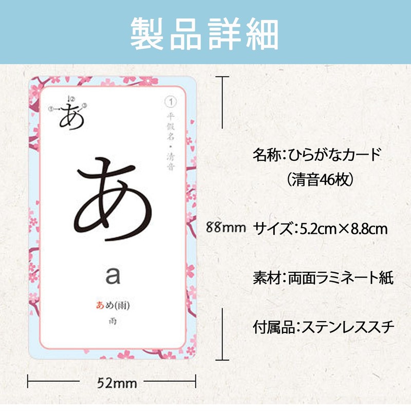 - (Card Contents) This flat name card set includes all the characters of the Japanese flat name, from "a" to "n". With these flat name cards, you can enjoy the game, practice spelling, and learn Japanese. Using these learning cards with your friends will make learning Japanese much easier