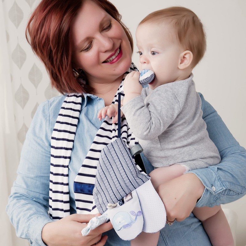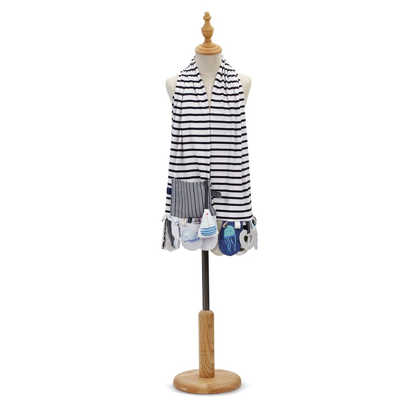 - La bufanda Blue Activity es una bufanda única y ligera que cuelga alrededor del cuello de la madre mientras mantiene al bebé feliz y entretenido. Incluye sonajero integrado, juguete chirriante, bolsillo y varias texturas.