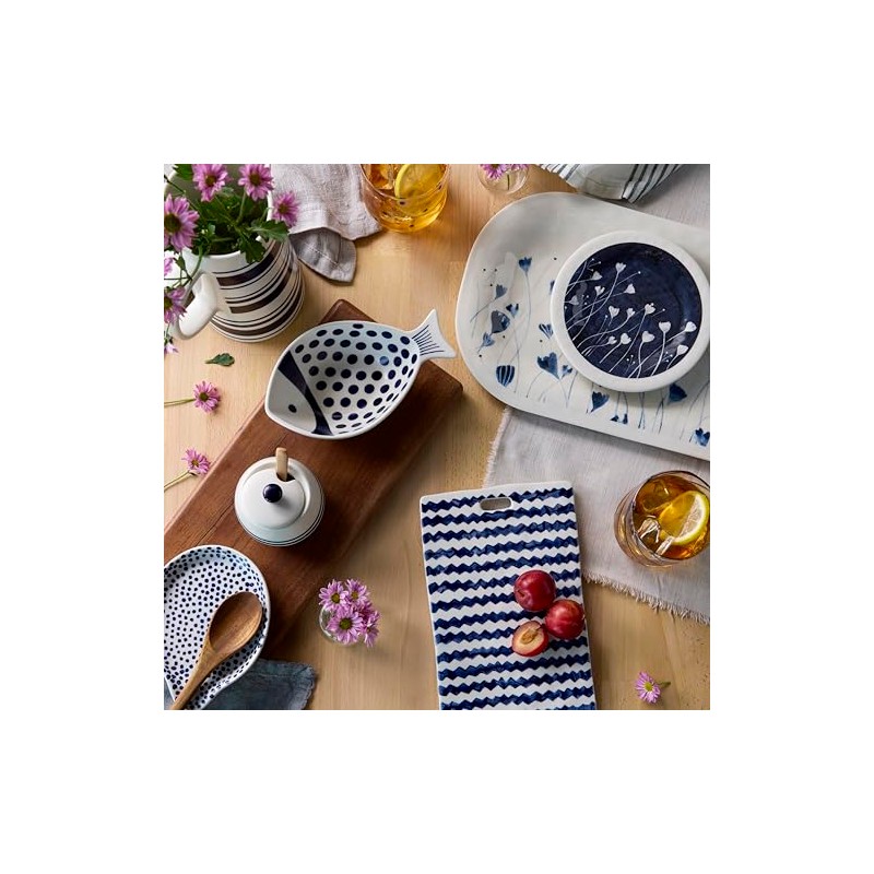 Demdaco Large Kitchen Serve ware, Hand Painted Pitcher Container, 34 Ounce Ceramic Stoneware, Blue Stipes