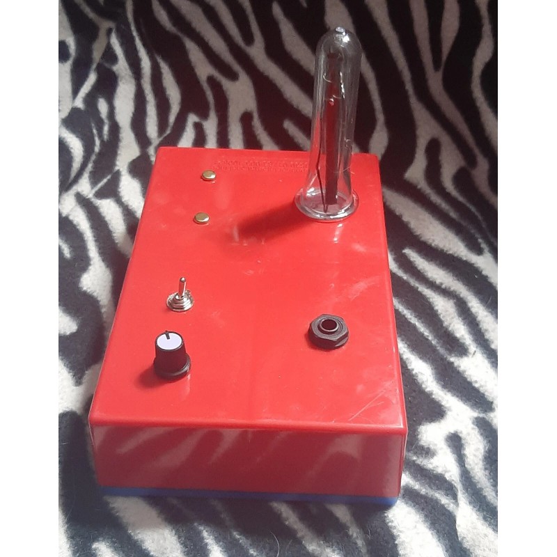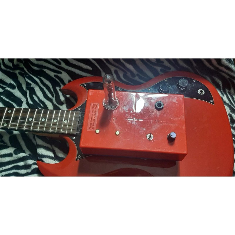 .plays with LIGHT wave your hand around in the light or point flashlights or laser pointers runs on 9v battery also has touch contacts and can played as a drone, standard guitar cables and guitar amp required not included