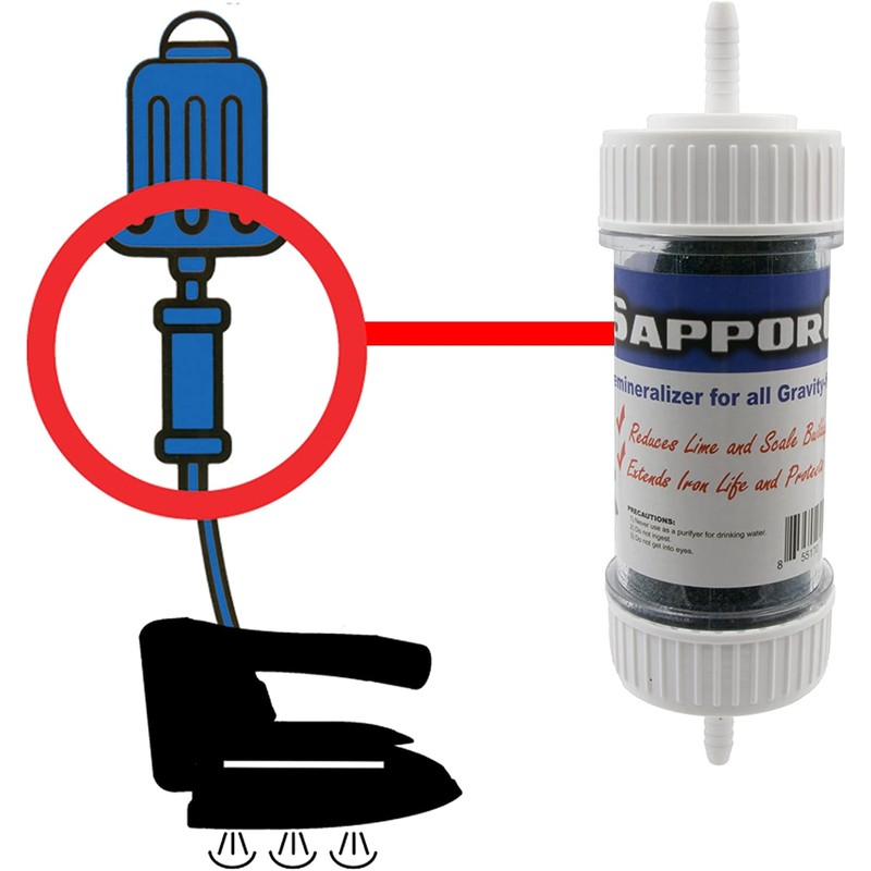 - In-line demineralizer cartridge fits Sapporo, Silver Star, Ace, Consew and all other major brands of hanging bottle steam iron