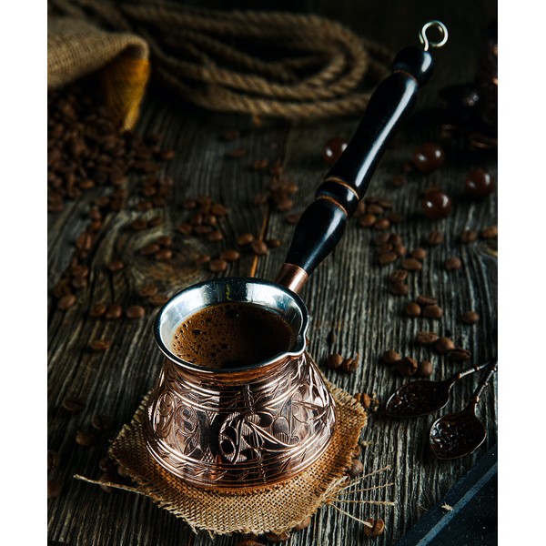 - Handmade Engraved Copper Stovetop Coffee Pot with Wooden Handle & Wooden Spoon. Made in Turkey.