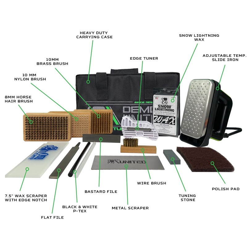 DEMON UNITED USA Silver Edition Ski & Snowboard Tuning Kit w/All Season Wax, Ski Hot Wax Iron, Edge Tuner, Metal Scraper, & More! (Silver Edition Plus Base Cleaner)