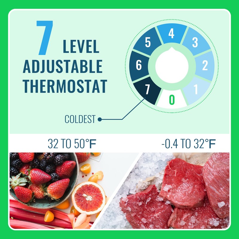 • Adjustable Temperature Knob: This small dorm fridge has seven temperature settings with exceptional cooling capability, improves the effect of food preservation; The temperature range from -0.4 °F to 50 °F