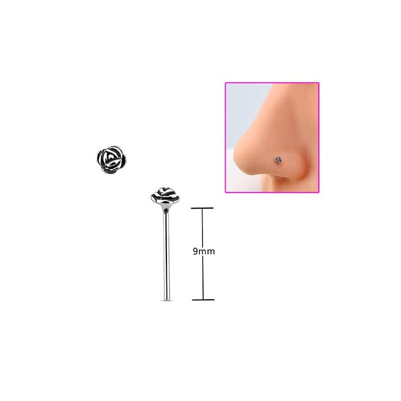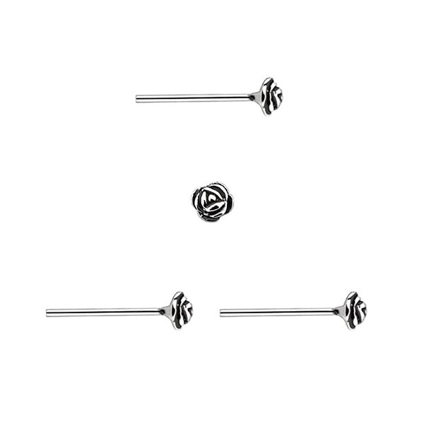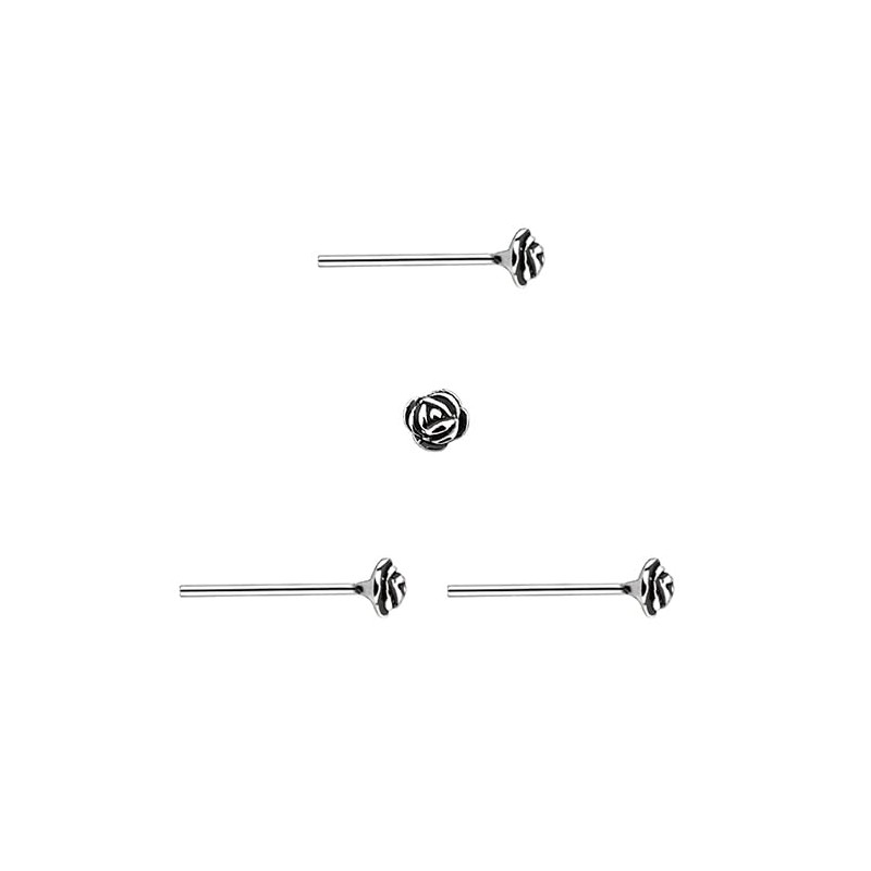 - 3 x silver nose studs, small rose of 2 mm, fine bar 0.6 mm.