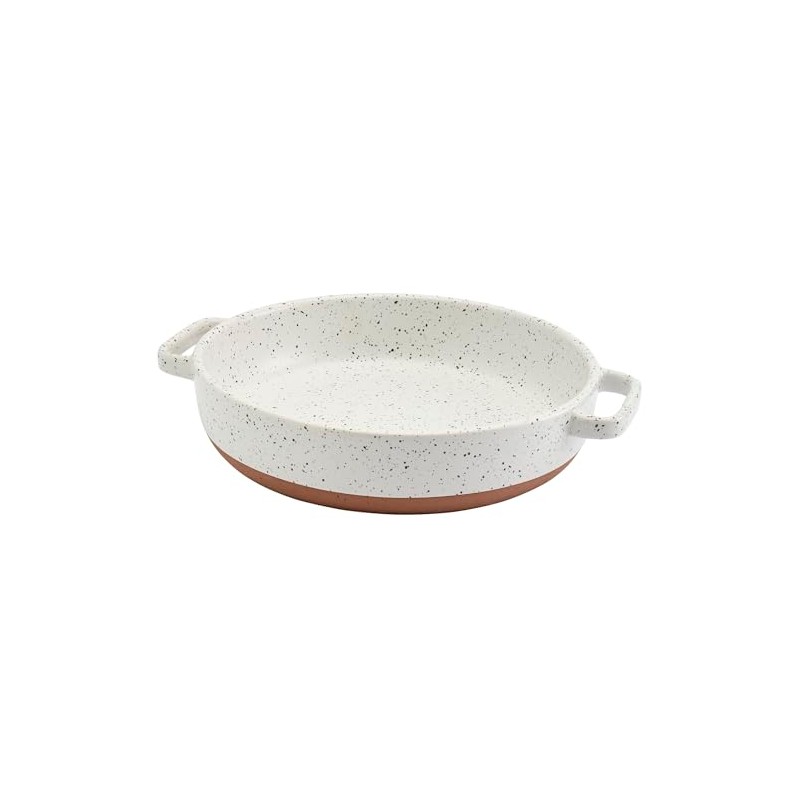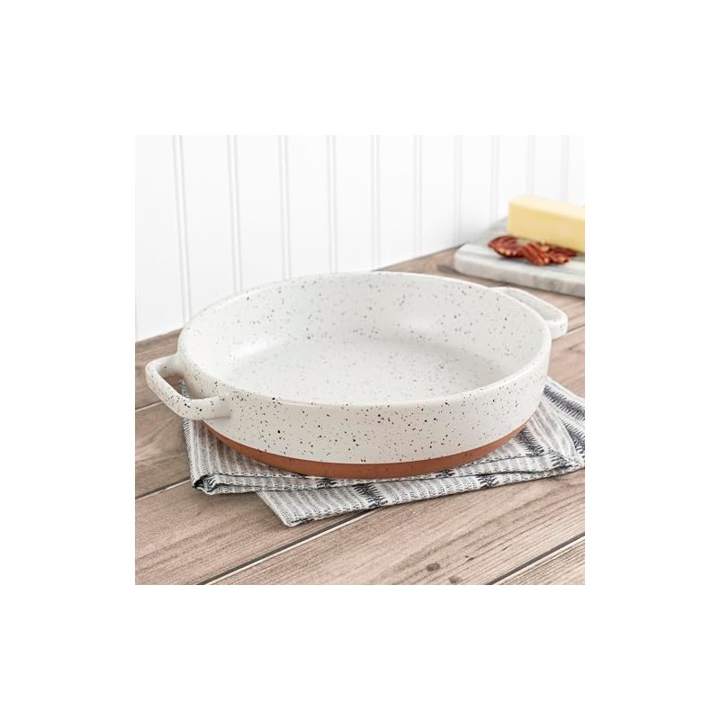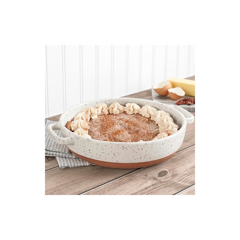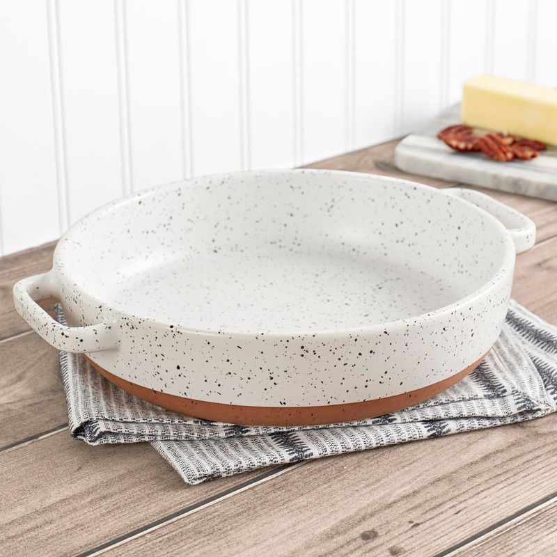 Denmark Tools For Cooks 1.7 Quart Speckled White Round Stoneware Pie Dish Baking Pan with Handles
