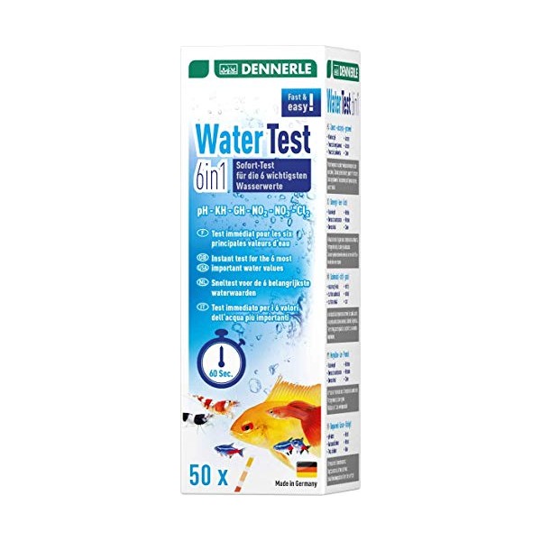 - Tests the 6 most important water values: pH, carbonate hardness, total hardness, nitrite, nitrate and chlorine