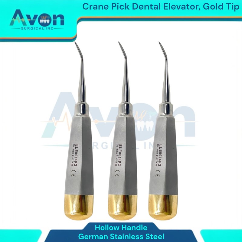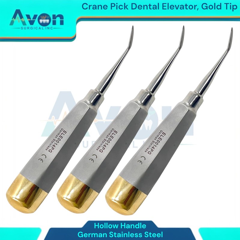 - Includes: Set of 3 - Crane Pick Dental Elevator, Slight Bent Tip, Gold End Hollow Handle - German Stainless Steel.