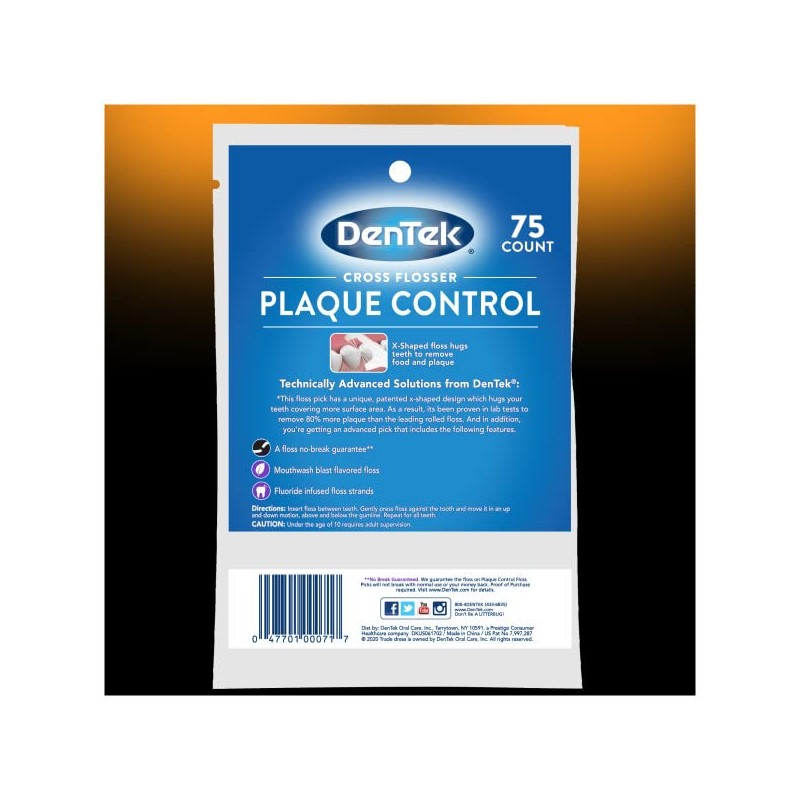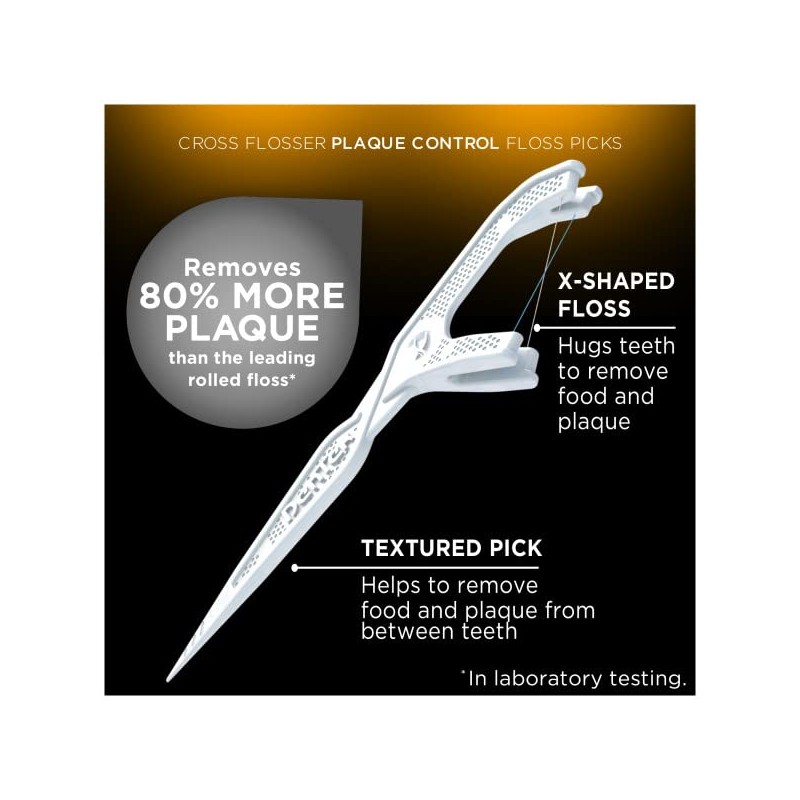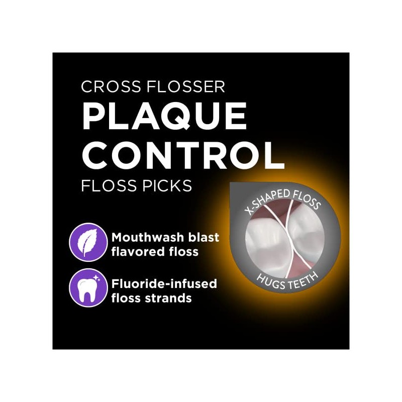 DenTek Cross Flosser Plaque Control Floss Picks feature X-Shaped floss that hugs teeth to remove food and plaque Removes 80% more plaque than the leading rolled floss* *In laboratory testing Unique 2x Cross Floss design curves around teeth to clean better Mouthwash blast flavored scrubbing floss infused with fluoride Floss no-break assurance – DenTek assures the floss on DenTek Cross Flosser Plaque Control Floss Picks will not break with normal use