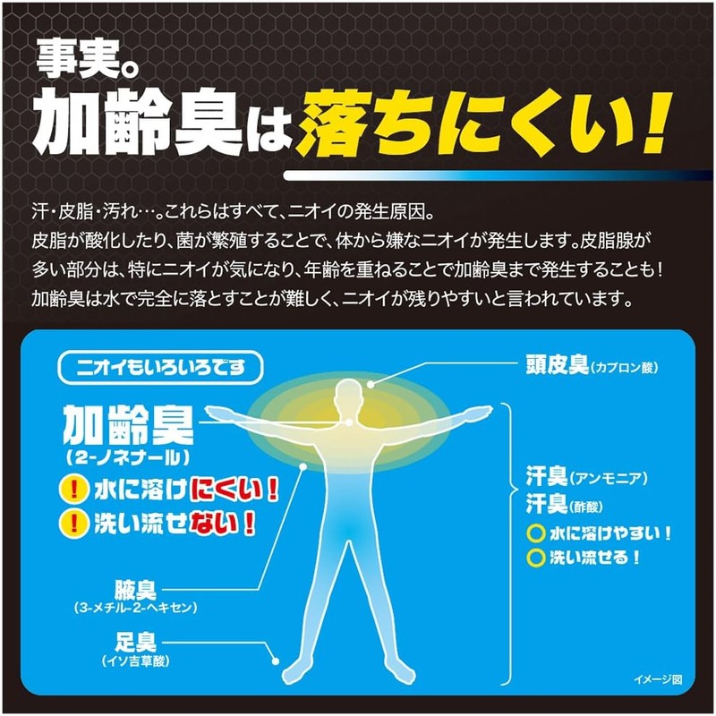 - It can also be used to thoroughly wash away body odor caused by aging on the face, neck, and behind the ears. *Effective thanks to functional fragrances.