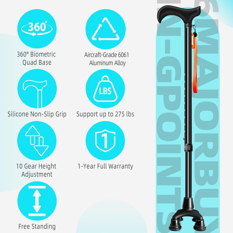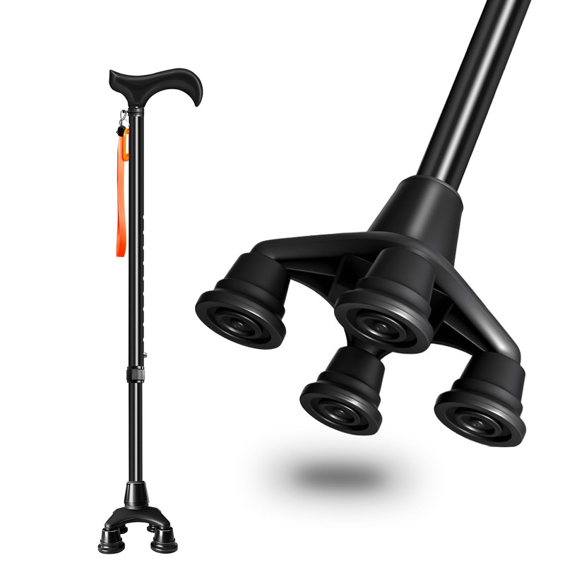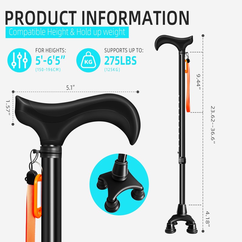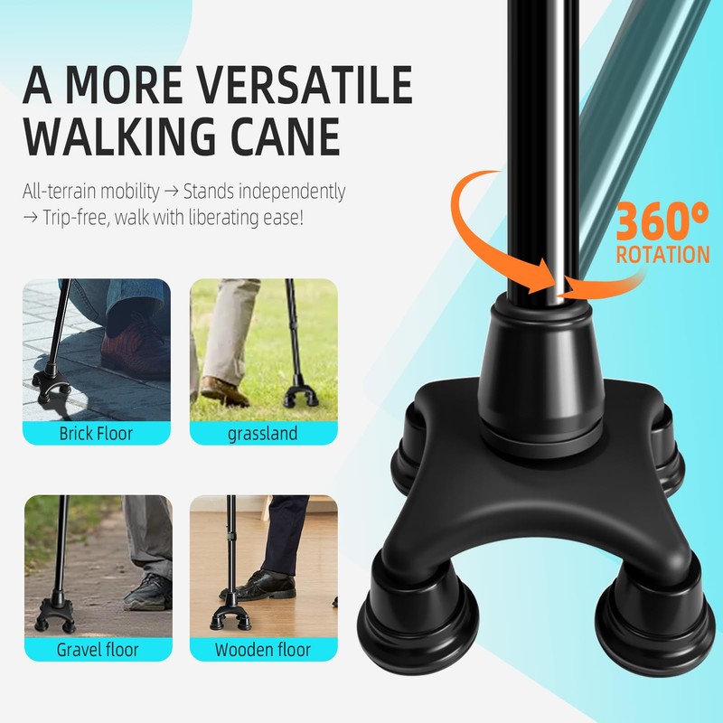- STABLE & SELF-STANDING, SAFETY WHEREVER YOU GO : Engineered for universal safety, this walking cane for men and women boasts a wide quad-base design. Its optimized ground-contact structure and low center of gravity allow the cane to stand firmly upright on floors, by beds, or near tables—resisting accidental tipping. Four strategically placed feet minimize tripping hazards, offering worry-free access and reliable security