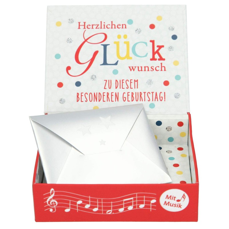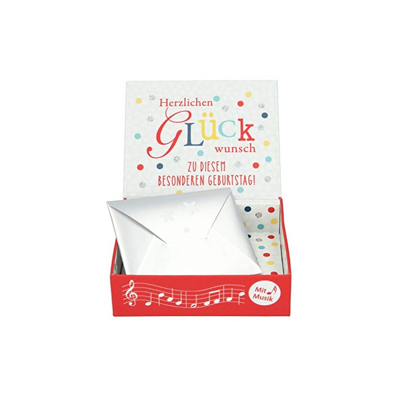 - The inside is decorated with many colourful dots and the saying "Herzlichen Glückwunsch zu diesem besonderen Geburtstag!" Designed