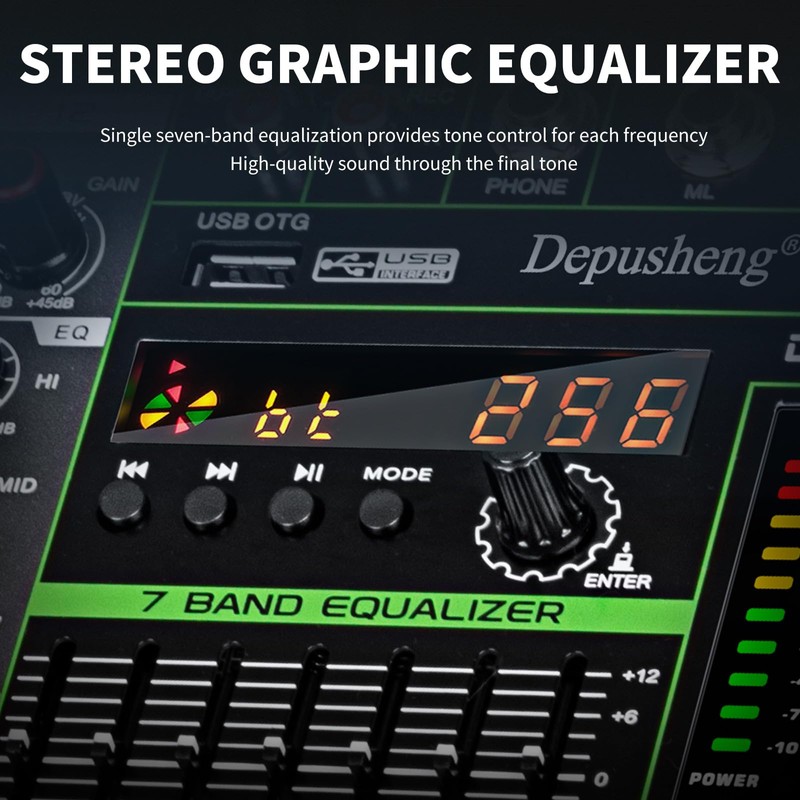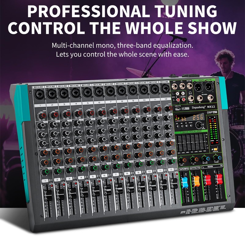 - 12 channel mixer, with MUTE , MP3 function with USB and DSP digital effects, rotary compressor for easy control, stronger bass and cleaner vocals.