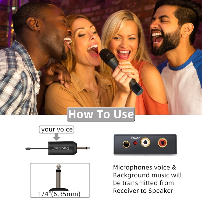 - Full compatibility: this wireless handheld microphone receiver has a 6.35 mm (1/4 inch) output. You can connect it to any of your sound systems such as PA, mixer, speaker, amplifier and karaoke devices with 6.35 mm (1/4 inch) microphone input. Your vocals are transmitted wirelessly to the sound system. If your sound system has a 3.5mm microphone input, use the included 3.5mm to 6.35mm adapter.