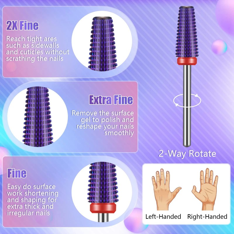 Tapered Barrel Carbide Nail Bit: Includes a finer grit at the tip of the bit to avoid any damage to the cuticle and surrounding nail wall and a coarser grit towards the base of the bit