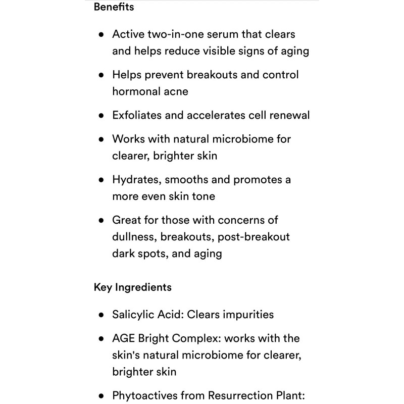 This active two-in-one serum clears and helps prevent breakouts while reducing visible skin aging. Salicylic Acid reduces breakouts AGE Bright™ Complex works with the skin's natural microbiome for clearer brighter skin. Phytoactives from Resurrection Plant hydrate and smooth skin. Niacinamide and White Shiitake Mushroom promote even skin tone.