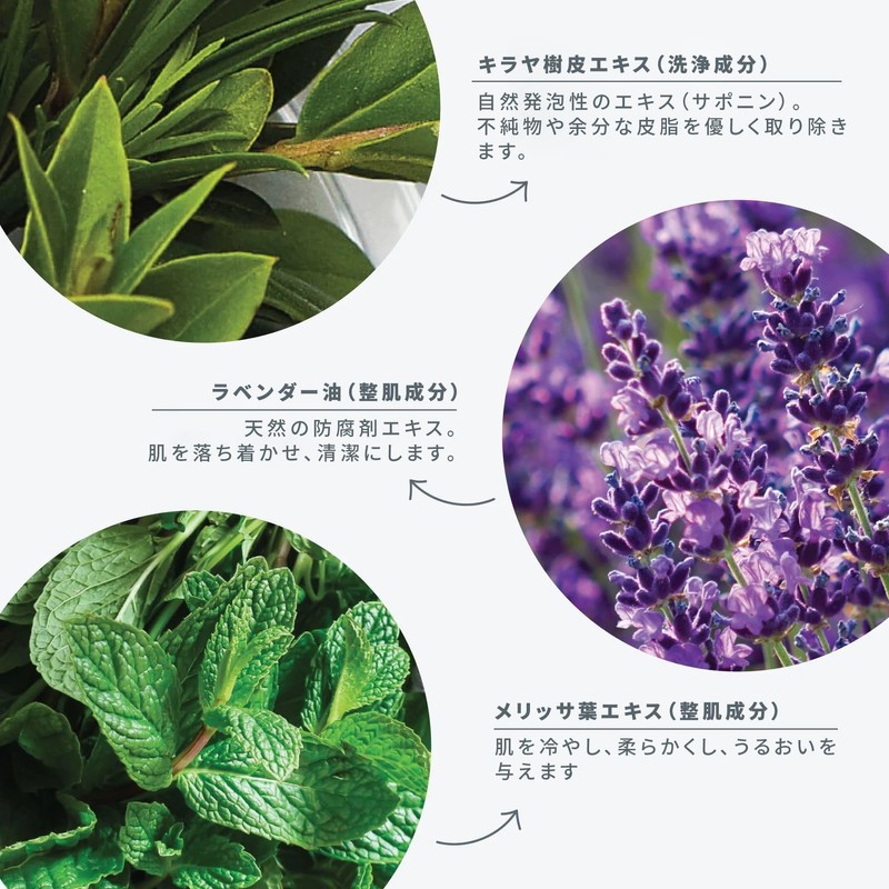 - Kiraya Bark Extract (Cleaning Ingredient): Natural foam extract (saponin), gently removes impurities and excess sebum. Lavender Oil (Skin Conditioning Ingredient): Natural preservative extract. It can help you calm and clean your skin. Melissa Leaf Extract (Skin Conditioning Agent): Cools, softens and moisturizes skin