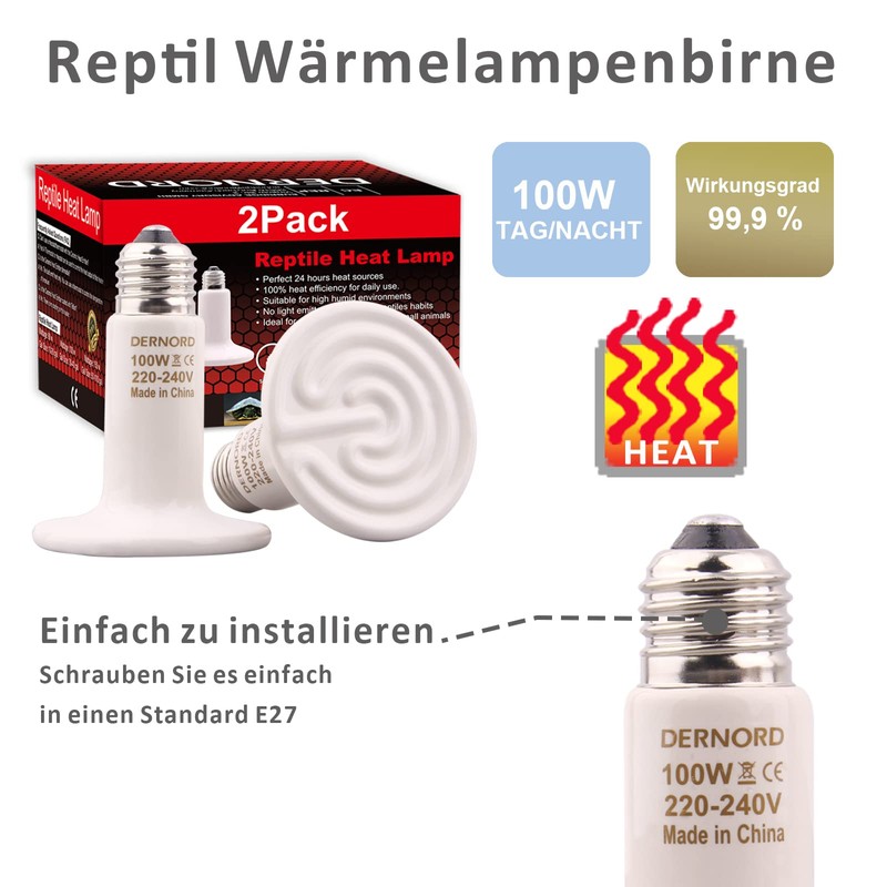 DERNORD Reptile Heat Lamp Terrarium 100 Watt Pack of 2 - Ceramic Heater for Turtle Prehistoric Crabs Spider Chicks Snakes Quail E27 Heating Lamp Animals