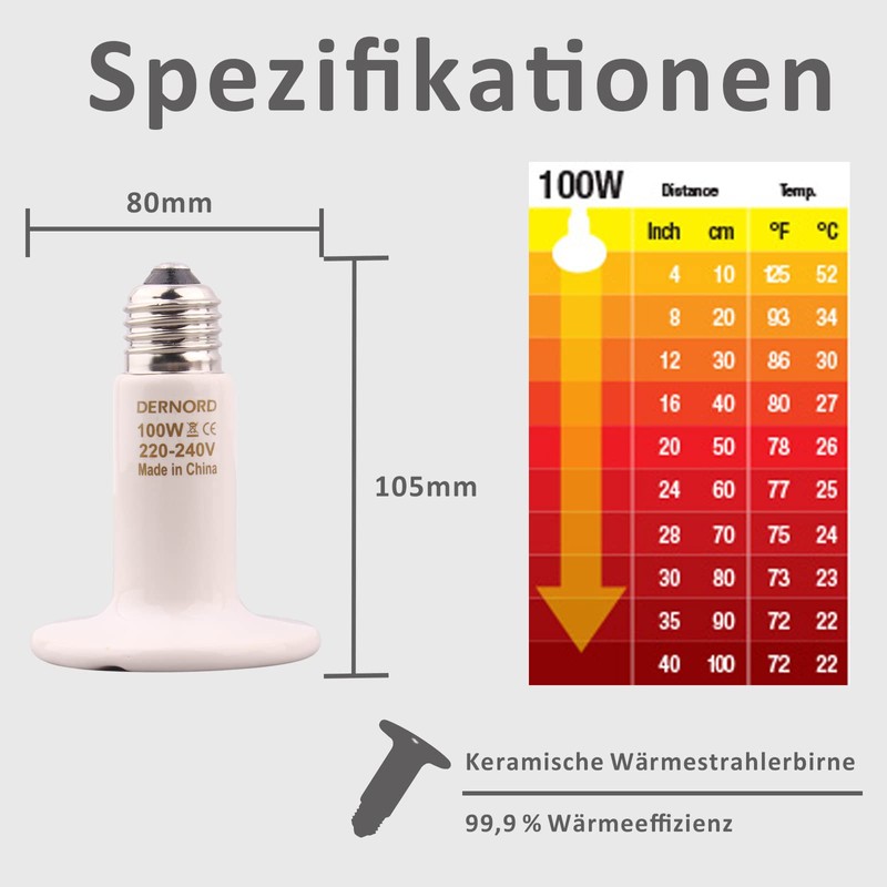 - Durable and safe design: this ceramic heat lamp is made of high-quality ceramic and is more stable and durable than conventional heating lamps. It is compatible with ceramic socket E27 and works with 230 volts for easy installation. Pay attention to safety by maintaining a distance of at least 30 cm from the animals and avoiding frequent switching on and off