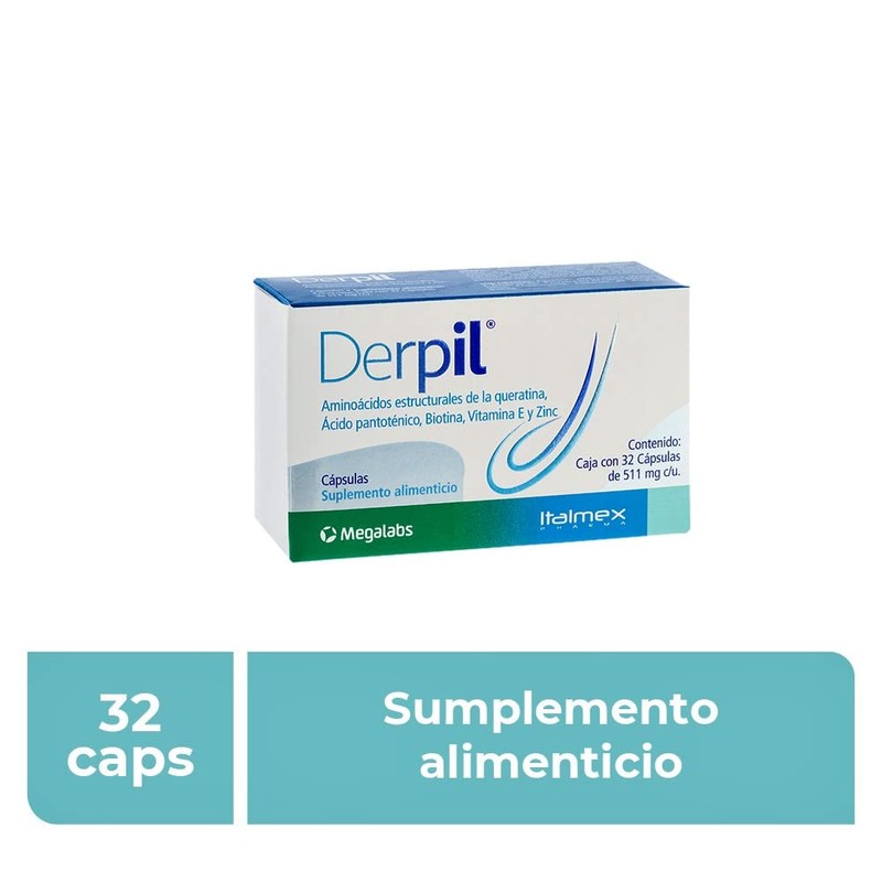 Derpil Vitaminas, Minerales y Aminoácidos Estructurales de la Queratina, Suplemento Alimenticio, caja con 32 cápsulas