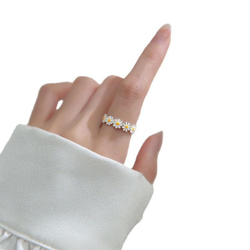 Dervivea Boho Daisy Flower Ring Silver Daisy Adjustable Open Ring White Enamel Flower Wrap Ring Tiny Sunflower Finger Ring Silver Open Statement Ring Jewelry for Women