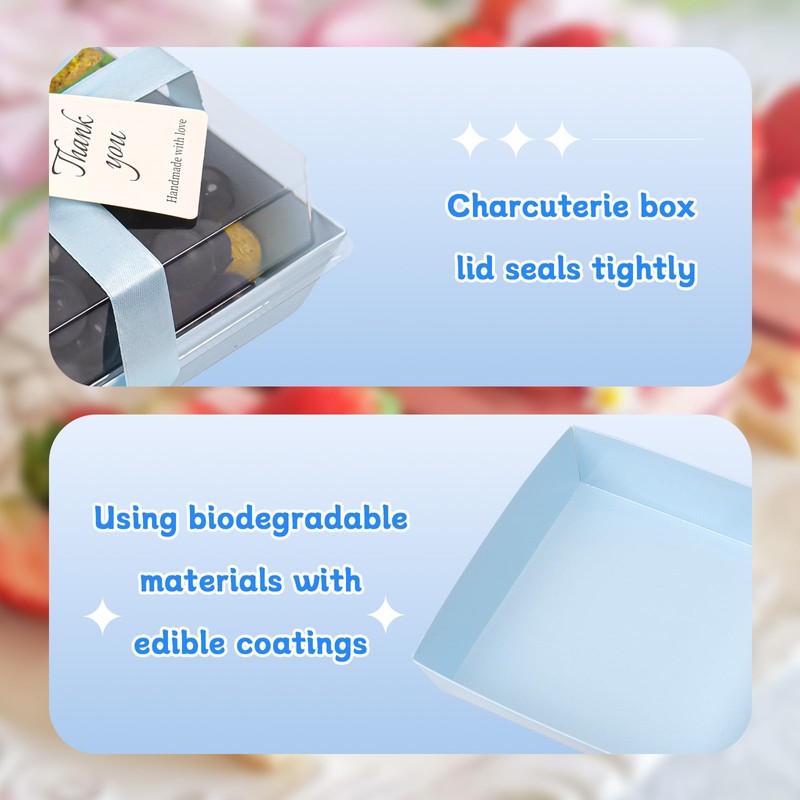 - Durable Mini Charcuterie Boxes: Mini charcuterie boxes are made with food-grade materials, featuring an edible oil-resistant coating to keep your food fresh and prevent leaks. The secure, snap-on clear lids ensure your items stay in place, making these boxes perfect for both sweet and savory treats.