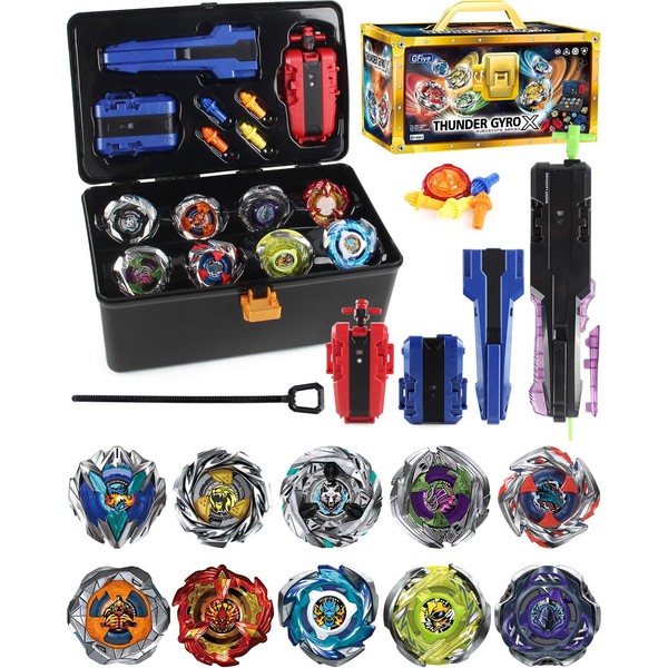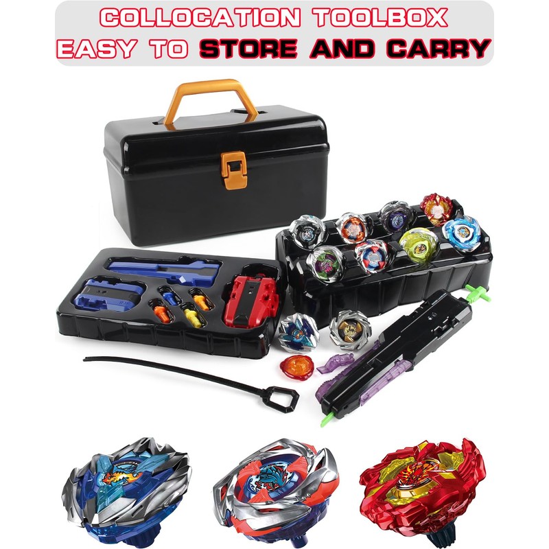 - 【PORTABLE STORAGE BOX SET INCLUDED】 DESAMVAP X Beys set includes 10 Gyro Tops(6-UX BEYS、3-CX BEYS、1-BX BEY), 3 Launchers and 1 Grip with Storage Box. Everything you need for an exciting battle game is right here! The portable gift box design makes it easy to carry, so you’re always ready to join a battle or challenge friends anytime, anywhere.