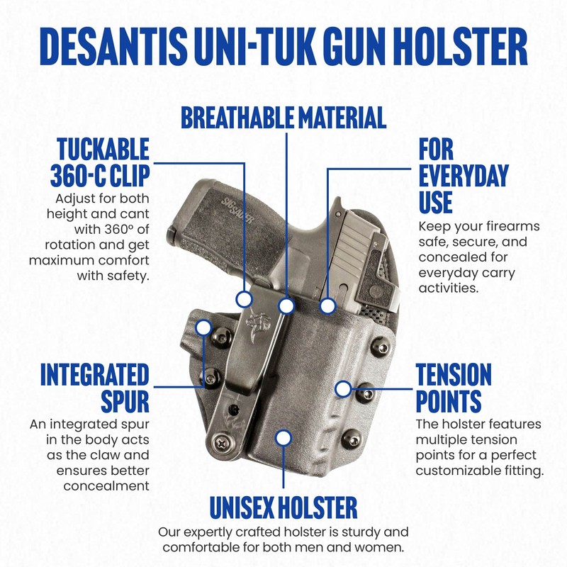 - Tuckable 360C Clip: Uni-Tuk pistol holster is equipped with DeSantis’ proprietary Tuckable 360-C Clip; The clip can be adjusted for both height and cant with 360° of rotation and gives maximum comfort with safety